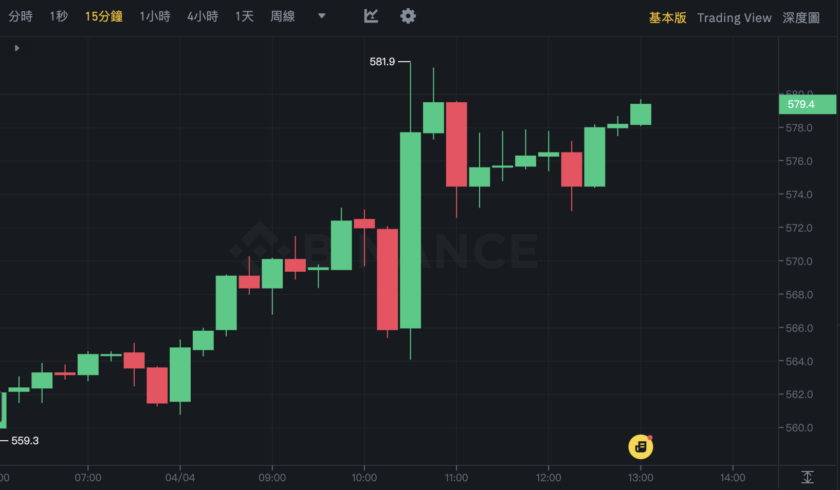截稿当下有续涨的势头,现报 579.4 美元,近 24 小时上涨 4.17%。