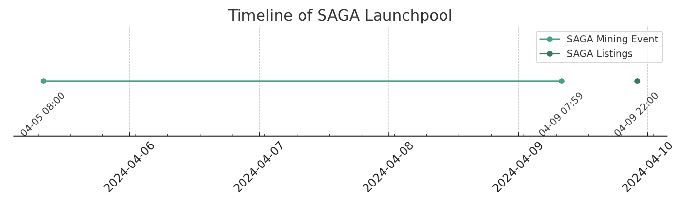 用户可在台湾时间 2024 年 4 月 5 日 8:00 至 2024 年 4 月 9 日 07:59,在 Launchpool 平台将 BNB 和 FDUSD 投入 SAGA 矿池中进行为期四天的新币挖矿活动,以获得 SAGA 代币奖励。