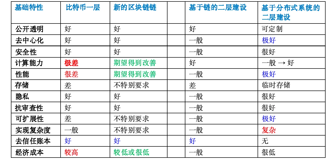 在 1.2 节中我们引用了比特币一层的基础特点和二层建设的特点的图表。我们是想找个一个具有和比特币相似特征,能够将比特币的表现差的地方提高的区块链系统(这里必须是 区块链,因为需要去信任账本功能)。简单总结陈一句话:希望这条新链具有比特币的这些 优良特性(公开透明性、去中心化能力、安全性、抗审查性),在计算能力、性能、经济成 本方面得到改善,尤其是经济成本能够降低。如果不能在计算能力和性能方面提高,只降低 经济成本也完全可以接受。