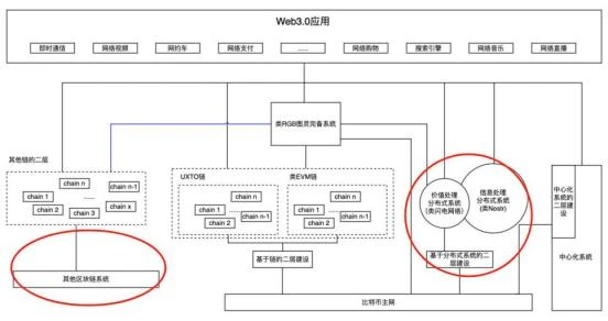 参考 Web3.0 的应用架构图,大概率会在其他区块链系统或者分布式系统中诞生。这里所说的在分布式系统中诞生,是借助分布式系统的现有架构,诞生一个建立在这个架构上的 区块链系统。如果借助 Lightning Network 或者 Nostr 会不会更容易一些?因为这些网络的 结构已经具有众多的节点,如果能让产生某种共识协议,让这些节点做一些事情,还完成账本相关的工作,会不会更容易完成?也会更多方共赢?如下面的红圈所示的两个区域: