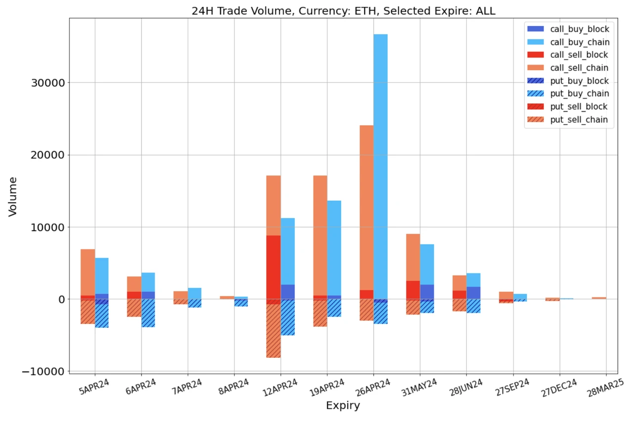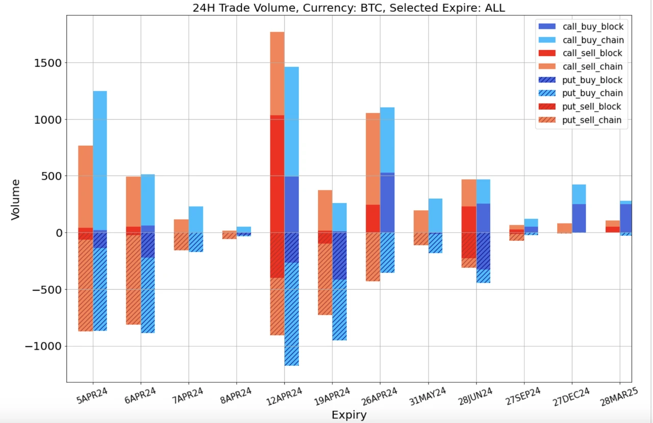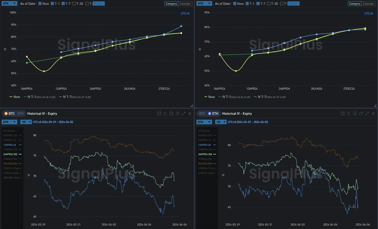 交易方面,ETH 的 Put 依然无人问津,前端位于 0.1 ~ 0.15 Delta 的看涨期权(12 APR 3700-C/19 APR 3900-C/26 APR 4000-C)遭到大量抛售;BTC 方面, 12 APR 24 70000-C 遭到强烈的抛压, 26 APR 24 以 73000 为分界点形成 Long Call Spread Flow, 6 月则收获了一组来自大宗的 20 0x 4 Long ButterFly,似乎能看到交易员们表达出的 近期有限看涨观点,以及对远期波动的展望 。