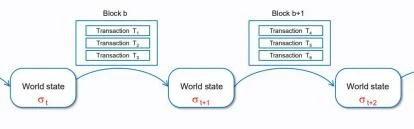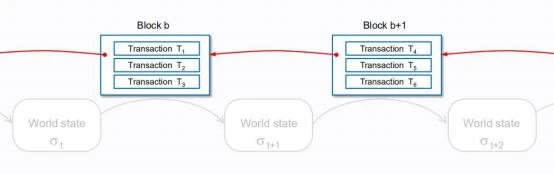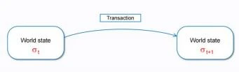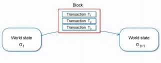 从状态的角度看,区块链是一个基于交易的状态机。一个交易是触发条件,使得一个原始状态σt ,在交易的作用下,转变到下一个状态σt+ 1 。