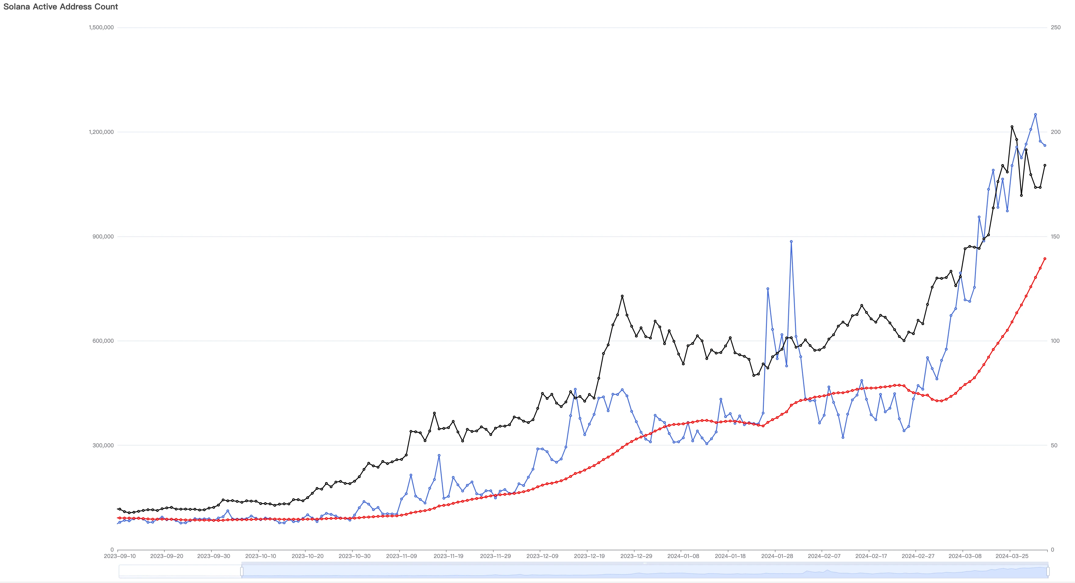 检视 Solana 用户新增统计图表,可以发现它呈现出非常完美的脉冲式增长态势。2023 年,其新增用户与价格持续缓慢增长,至 11 月中旬增长曲线斜率开始增大,由日新增 30 万左右提升至 1 月中旬的 160 万左右,足足增长了 4 倍多。此后,在 1 月下旬和 2 月下旬出现两次新增回落之后,整个 3 月都处于暴力增长之中,月初至月底 30 天内增长了接近 1 倍。