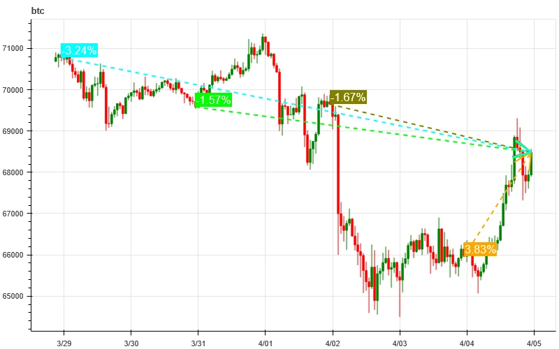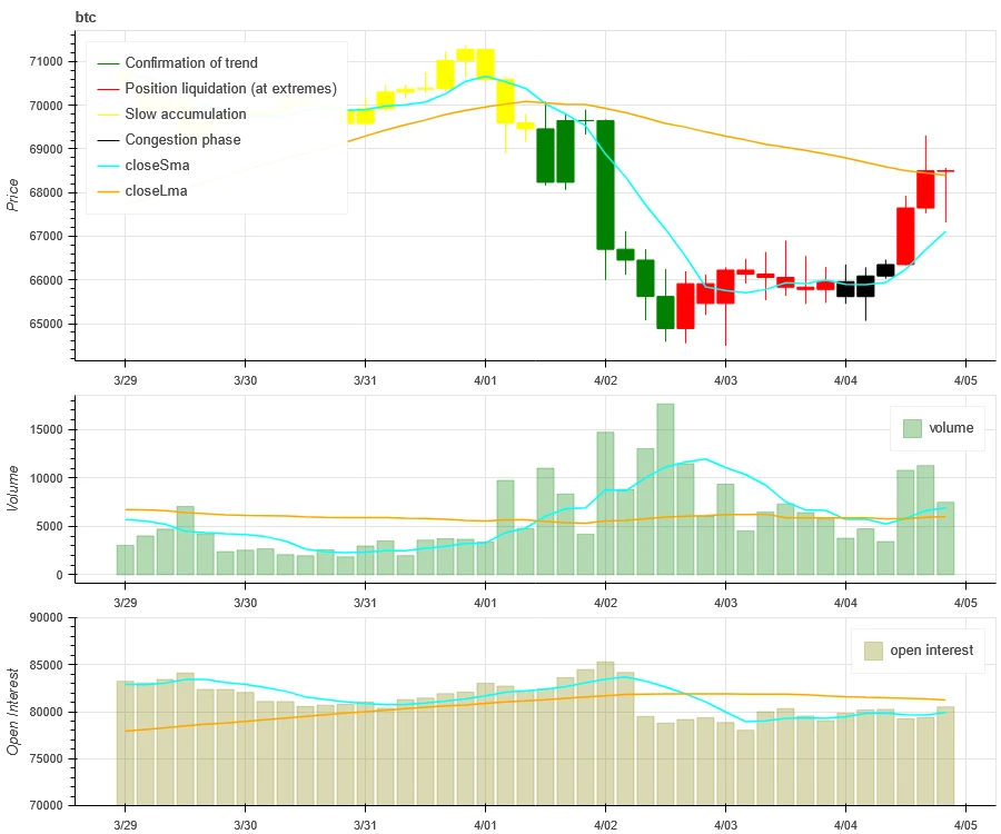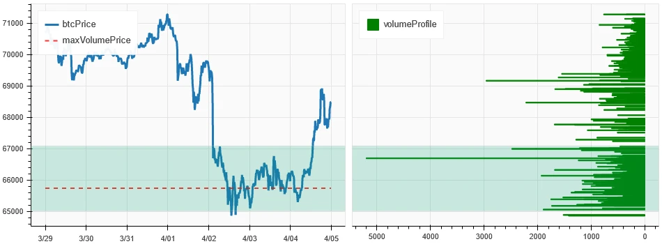 本周 2024.04.05 20: 30 (北京时间)非农数据公布后,比特币小幅下跌后反弹至最高 68000 美元附近,价格在 67000 美元产生较大的成交量换手,短期内在这个位置形成支撑位,目前价格在支撑上方,后续需要继续观察行情是否有足够的上升动力。
