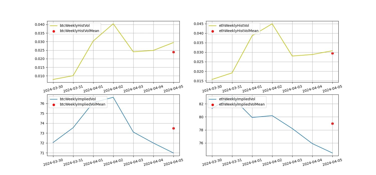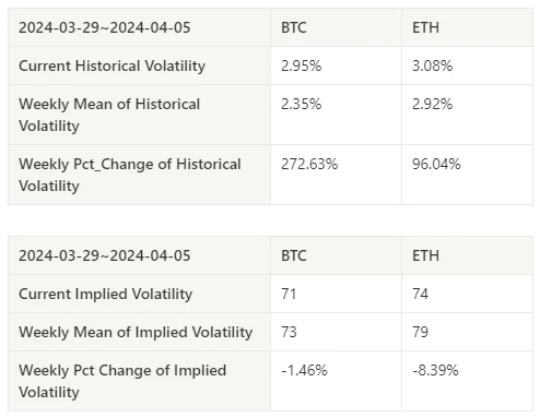 过去一周历史波动率 BTC 与 ETH 都在 4.2 时最高;隐含波动率 BTC 与 ETH 都较周初下降。