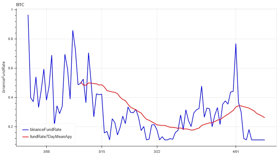 蓝色线为币安上 BTC 的资金费率,红色线为其 7 日平均