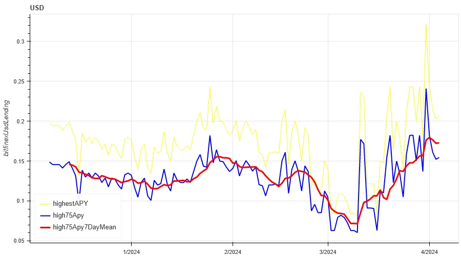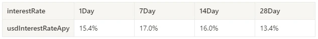 过去一周 USD 放贷年化收益平均为 14.8% ,短期利率上升至 15% 左右。
