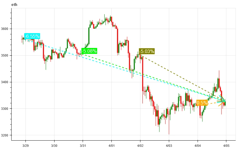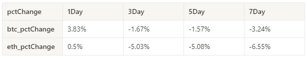 过去一周 BTC 价格下跌-3.24% ,ETH 价格-6.55% 。