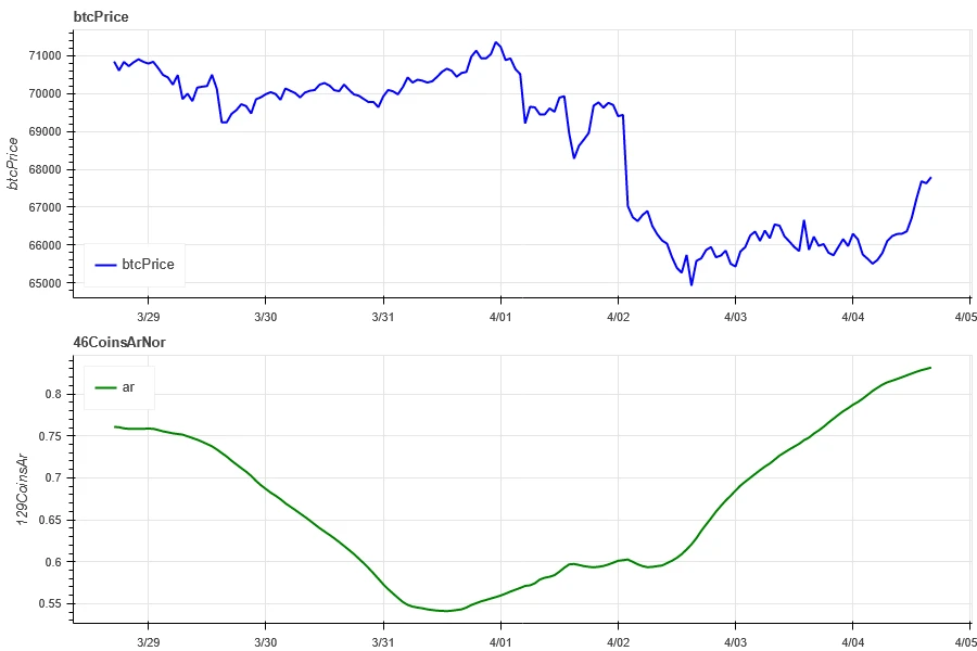 上图蓝色先为比特币价格,绿色线为['1000 floki', '1000 lunc', '1000 pepe', '1000 shib', '100 0x ec', '1inch', 'aave', 'ada', 'agix', 'algo', 'ankr', 'ant', 'ape', 'apt', 'arb', 'ar', 'astr', 'atom', 'audio', 'avax', 'axs', 'bal', 'band', 'bat', 'bch', 'bigtime', 'blur', 'bnb', 'btc', 'celo', 'cfx', 'chz', 'ckb', 'comp', 'crv', 'cvx', 'cyber', 'dash', 'dgb', 'doge', 'dot', 'dydx', 'egld', 'enj', 'ens', 'eos','etc', 'eth', 'fet', 'fil', 'flow', 'ftm', 'fxs', 'gala', 'gmt', 'gmx', 'grt', 'hbar', 'hot', 'icp', 'icx', 'imx', 'inj', 'iost', 'iotx', 'jasmy', 'kava', 'klay', 'ksm', 'ldo', 'link', 'loom', 'lpt', 'lqty', 'lrc', 'ltc', 'luna 2', 'magic', 'mana', 'matic', 'meme', 'mina', 'mkr', 'near', 'neo', 'ocean', 'one', 'ont', 'op', 'pendle', 'qnt', 'qtum', 'rndr', 'rose', 'rune', 'rvn', 'sand', 'sei', 'sfp', 'skl', 'snx', 'sol', 'ssv', 'stg', 'storj', 'stx', 'sui', 'sushi', 'sxp', 'theta', 'tia', 'trx', 't', 'uma', 'uni', 'vet', 'waves', 'wld', 'woo', 'xem', 'xlm', 'xmr', 'xrp', 'xtz', 'yfi', 'zec', 'zen', 'zil', 'zrx’]整体的相关性