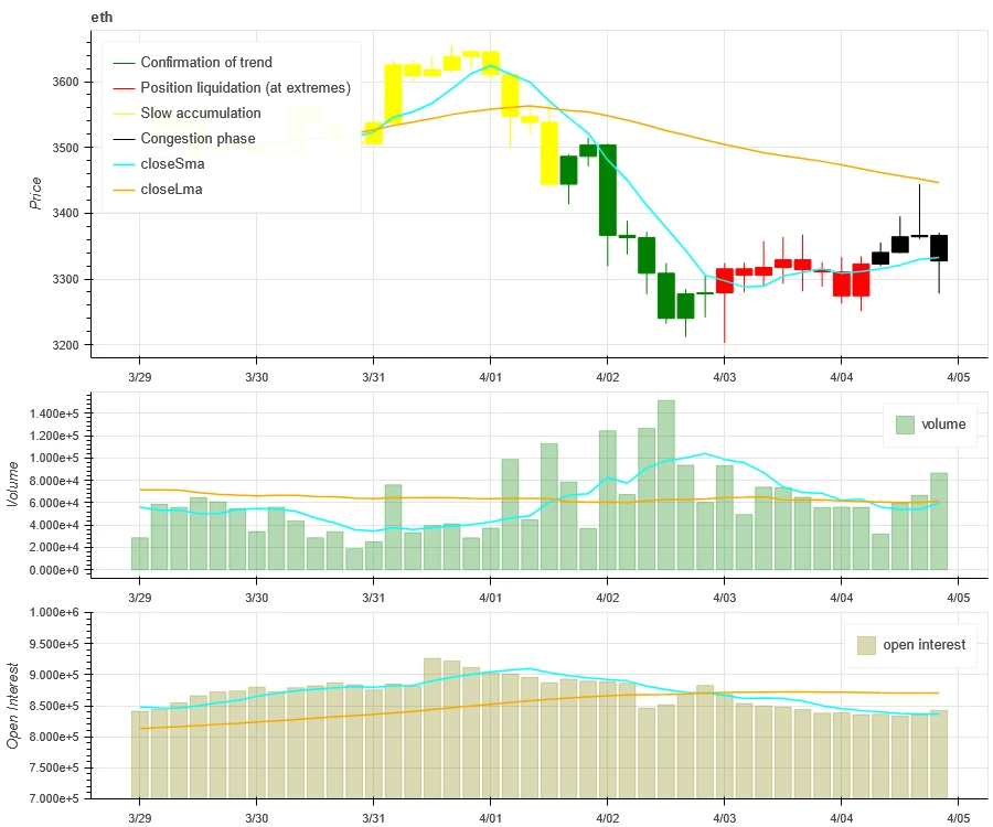 上图最上方 ETH 的价格走势,中间是成交量、最下方是未平仓量、浅蓝色是 1 天均值,橘色是 7 天均值。其中 K 线的颜色代表当前的状态,绿色是价格上升有成交量支持,红色是在平仓,黄色是在缓慢累积仓位,黑色是拥挤状态。