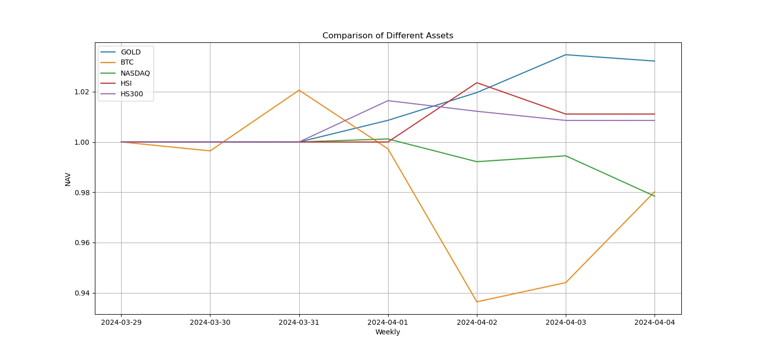 过去一周比特币/黄金/纳指/恒指/沪深 300 中,黄金最强势,而表现最差为纳指。
