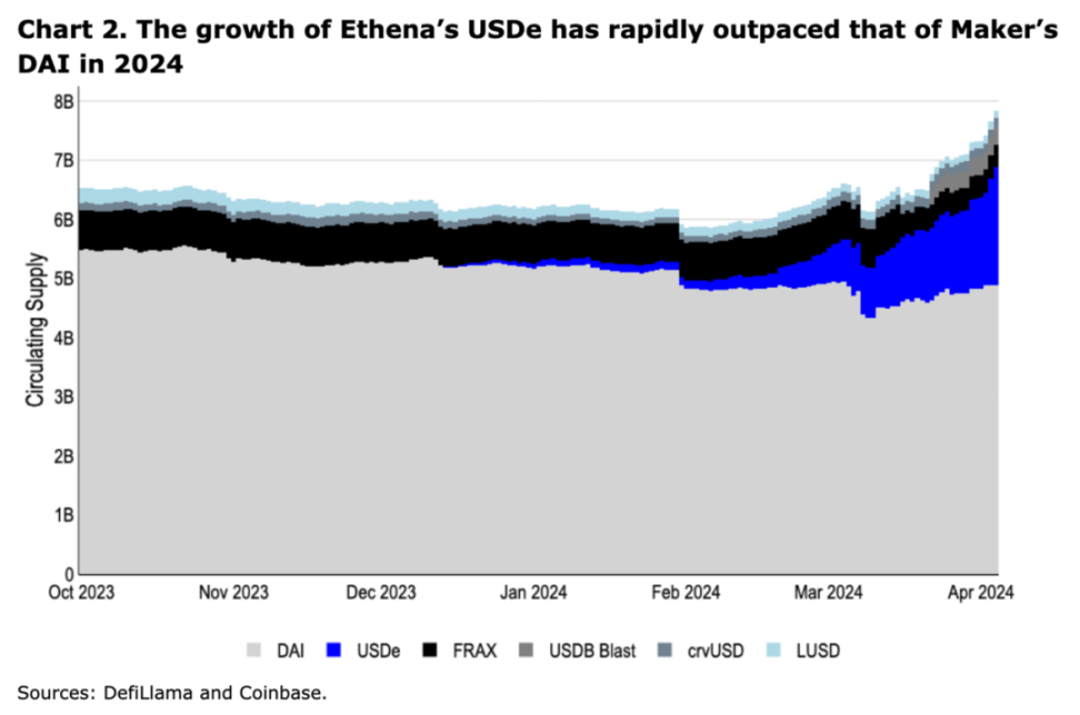 我们认为这场冲突可能预示着去中心化稳定币市场的转变。相对于 DAI,由于其更高的收益率和空投激励措施,Ethena 的 USDe 获得了快速的市场份额。这两种资产都有其发行能力的固有限制(与中心化稳定币相比)。DAI 供应需要超额抵押,因此受贷款人抵押品的约束。与此同时,美元受到期货未平仓市场的约束,如果其空头利率过大,利率将变得不可承受。