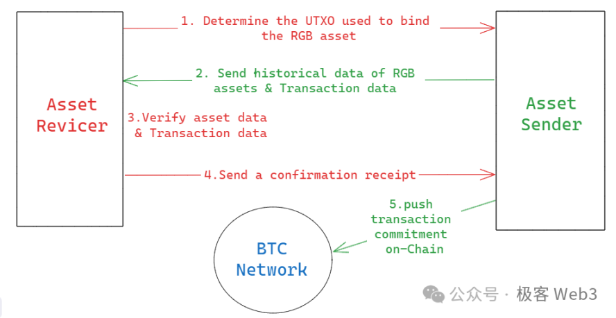 RGB 协议是一种特殊的 P2P 资产协议,是比特币链下的计算系统,它在某些方面与支付通道类似:用户要亲自运行客户端,自行验证与自己有关的转账行为(Verify by yourself)。即便你只是一个资产接收者,也要先确定资产发送者的转账声明没有错误,然后这笔转账声明才能生效。显然这与传统的资产发送与接收形式截然不同,我们将其称之为「交互式转账」。