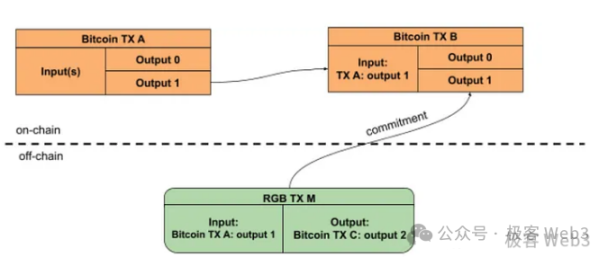 如果 Alice 想把 30 枚代币送给 Bob,可以先生成一个 Commitment,对应的声明是:把 UTXO A 关联的 RGB 代币,转移 30 枚给 Bob,70 枚转给自己控制的其他 UTXO。