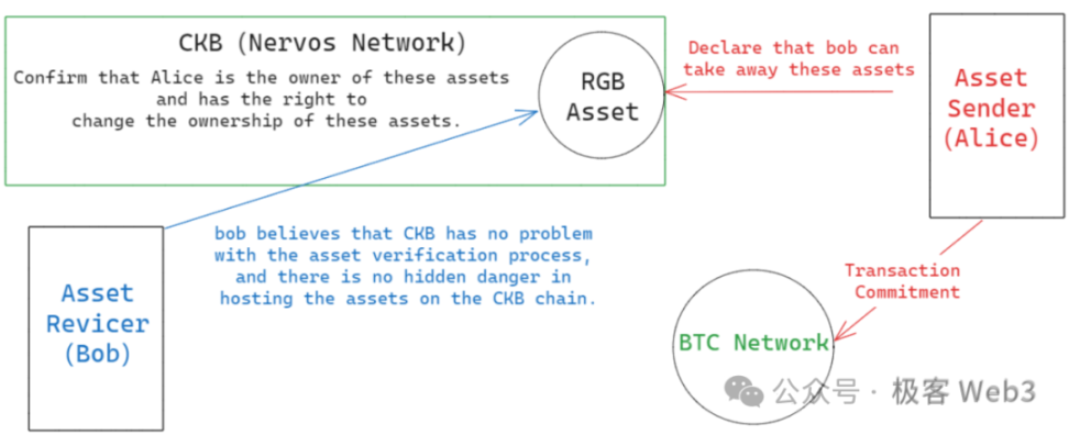 假设有个 RGB 用户叫 Bob,他认识 Alice,Alice 要给 Bob 转来 100 枚 TEST 代币。Alice 生成了「Alice to Bob」的转账信息后,要先把转账信息和涉及的资产数据发送给 Bob,让他亲自检查一遍,确定无误才会进入后续流程,最终成为一笔有效的 RGB 转账。所以说,RGB 协议是让用户亲自验证数据有效性,取代传统的共识算法。