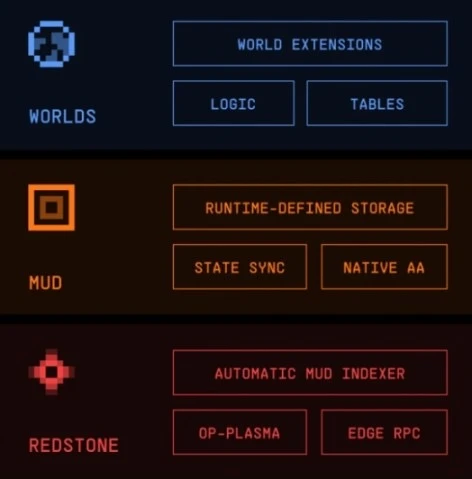 Lattice 的自主世界 / 全链游戏的原语由 Worlds 开发框架、MUD 游戏引擎和 Redstone 底层共识协议组成。