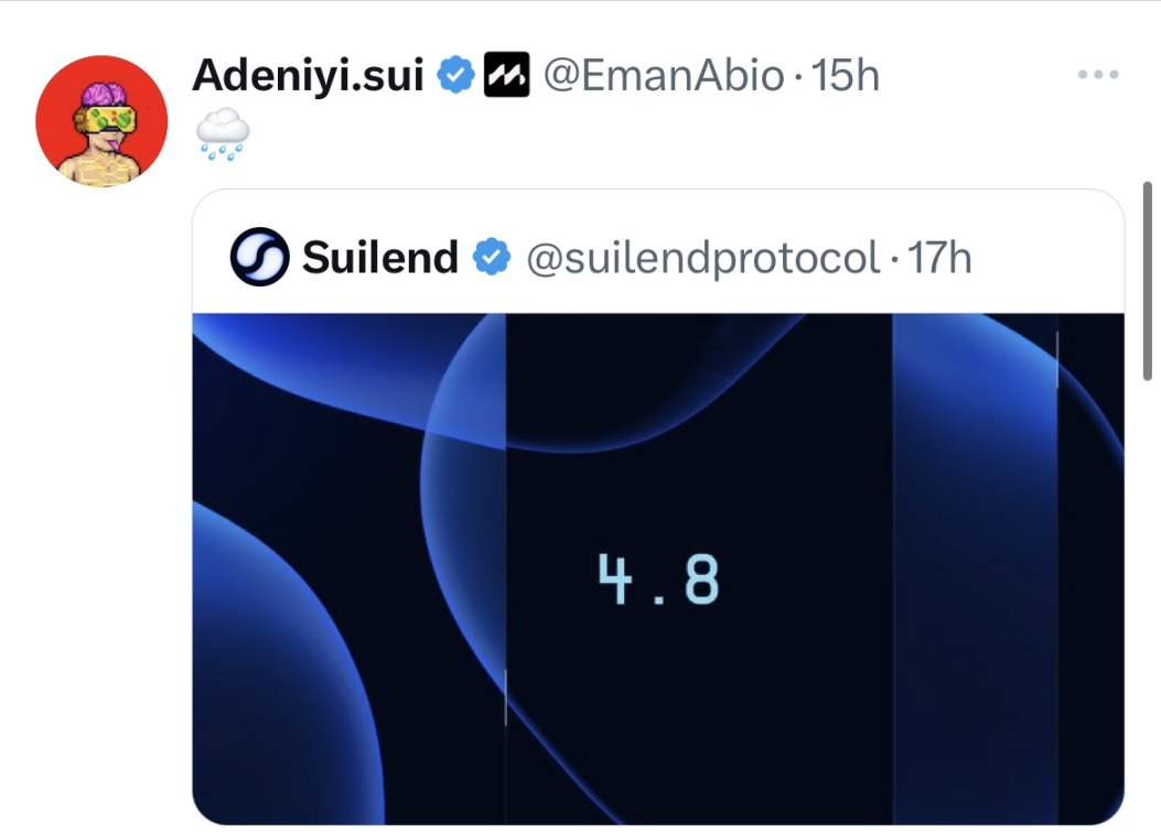 Suilend 是由 Solana 上借贷协议 Solend 创始人 0x Rooter 在 Sui 上创立的全新借贷项目。除了已确定会给 Solend 的用户空投外,大概率也会给 Sui 上的用户空投。在 4 月 7 日,其官推发布了一张图片,内容只有「 4.8 」这个日期,似乎暗示这天会有重要消息宣布。Adeniyi 转发了这条帖文,并配上?️下雨的云表情,可能在暗示将有空投。