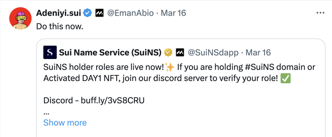 而 Mysten Labs 的核心项目主要包括 Sui 网络、已宣布将关停的 Sui Explorer、zkSend 和 zkLogin 等产品、Sui Wallet、SuiNS。SuiNS 是其中看上去发币、空投概率最大的项目。Adeniyi 在 3 月 16 日转发了该项目一条让域名持有者进入 Discord 得到验证角色的推文,并评论到:「现在就做这件事。」