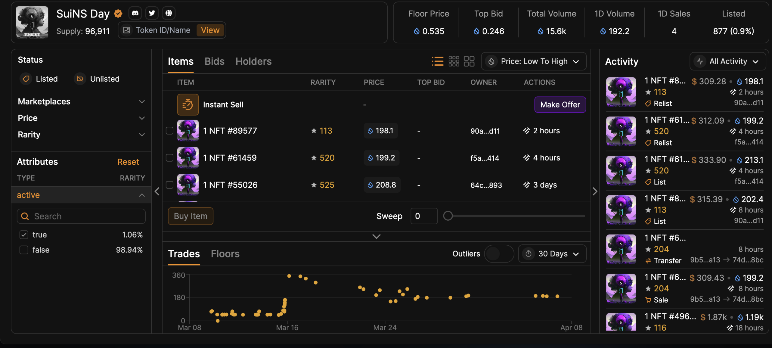 想要获得 Activited Day 1 NFT 角色,可以在 NFT 市场购买已激活的 SuiNS Day NFT。需要注意,未被激活的 SuiNS Day NFT 虽然比已激活的便宜,但已经毫无价值,不可再被激活。可在市场里将「active」特征设为「true」来筛选已激活的 NFT。