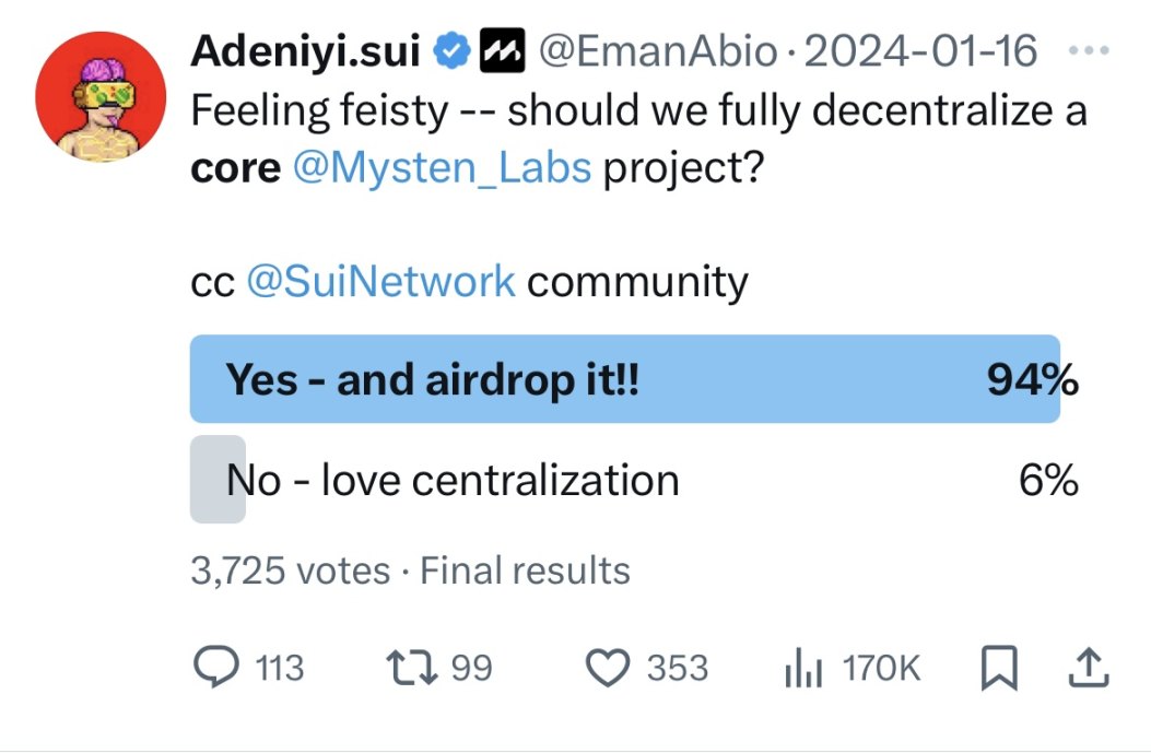 SuiNS 是 Sui 上的地址域名服务,在去年被 Mysten Labs 收购。今年 1 月时 Adeniyi 在 X 上做过一个问卷,主要内容是「我们应该让一个 Mysten Labs 的核心项目完全去中心化吗?」 94% 的人选择了「应该,并且空投它!」。