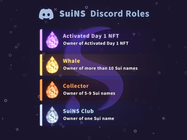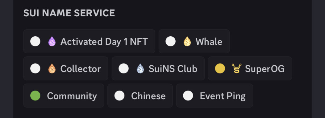 可获得的 DC 角色组有 5 种,分别是持有已激活 SuiNS Day NFT 获得的 Activited Day 1 NFT 角色,持有 10 个及以上域名的 Whale 巨鲸角色,持有 5 到 9 个域名的 Collector 收集者角色,以及最基础的 SuiNS Club 域名持有者角色。