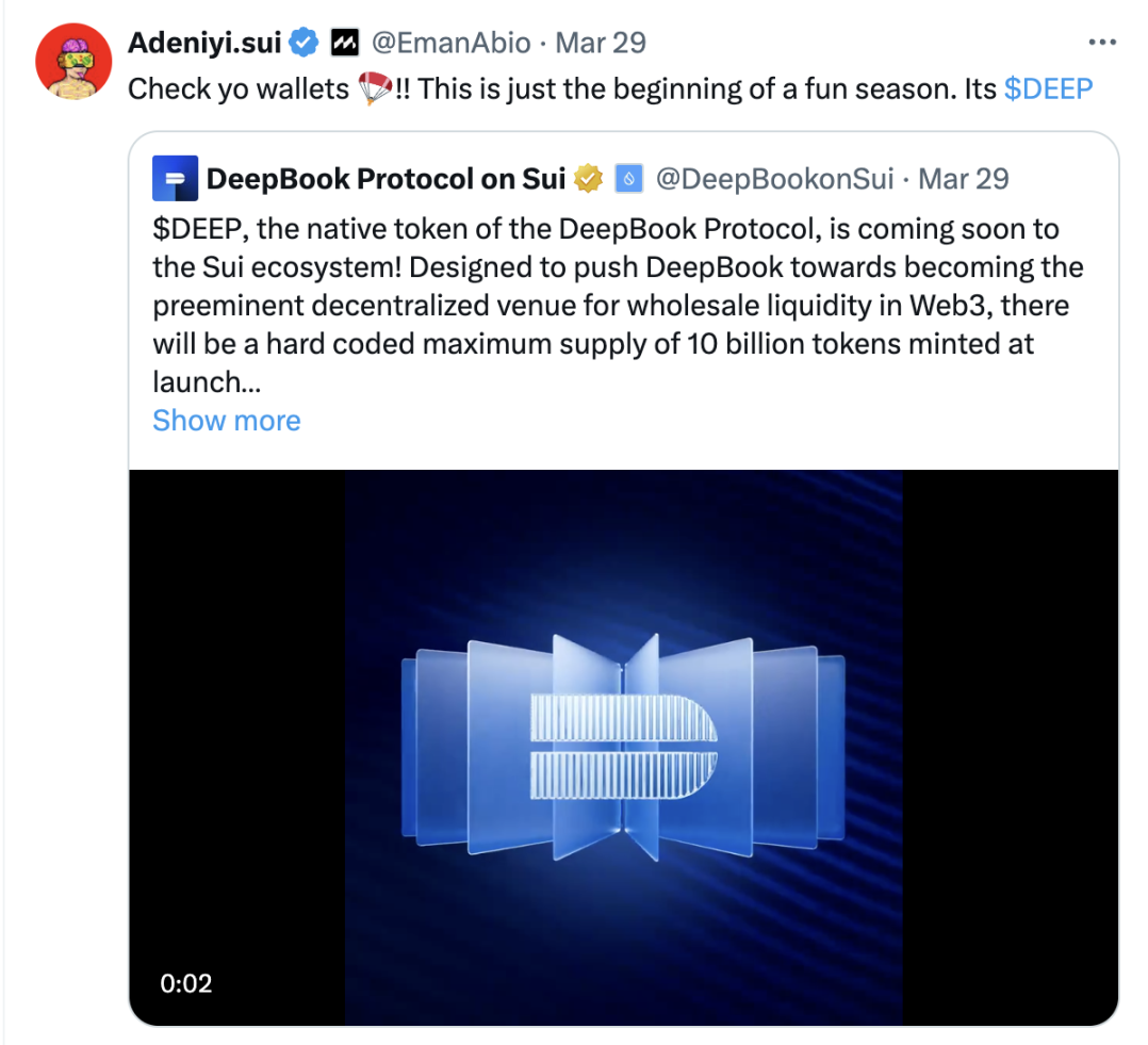 Sui 上订单薄流动性协议 DeepBook 在 3 月 29 日发推宣布空投时,他更是转推并评论到「检查你的钱包?,这只是一个有趣的季节的开始。」似乎也在暗示即将迎来空投季。
