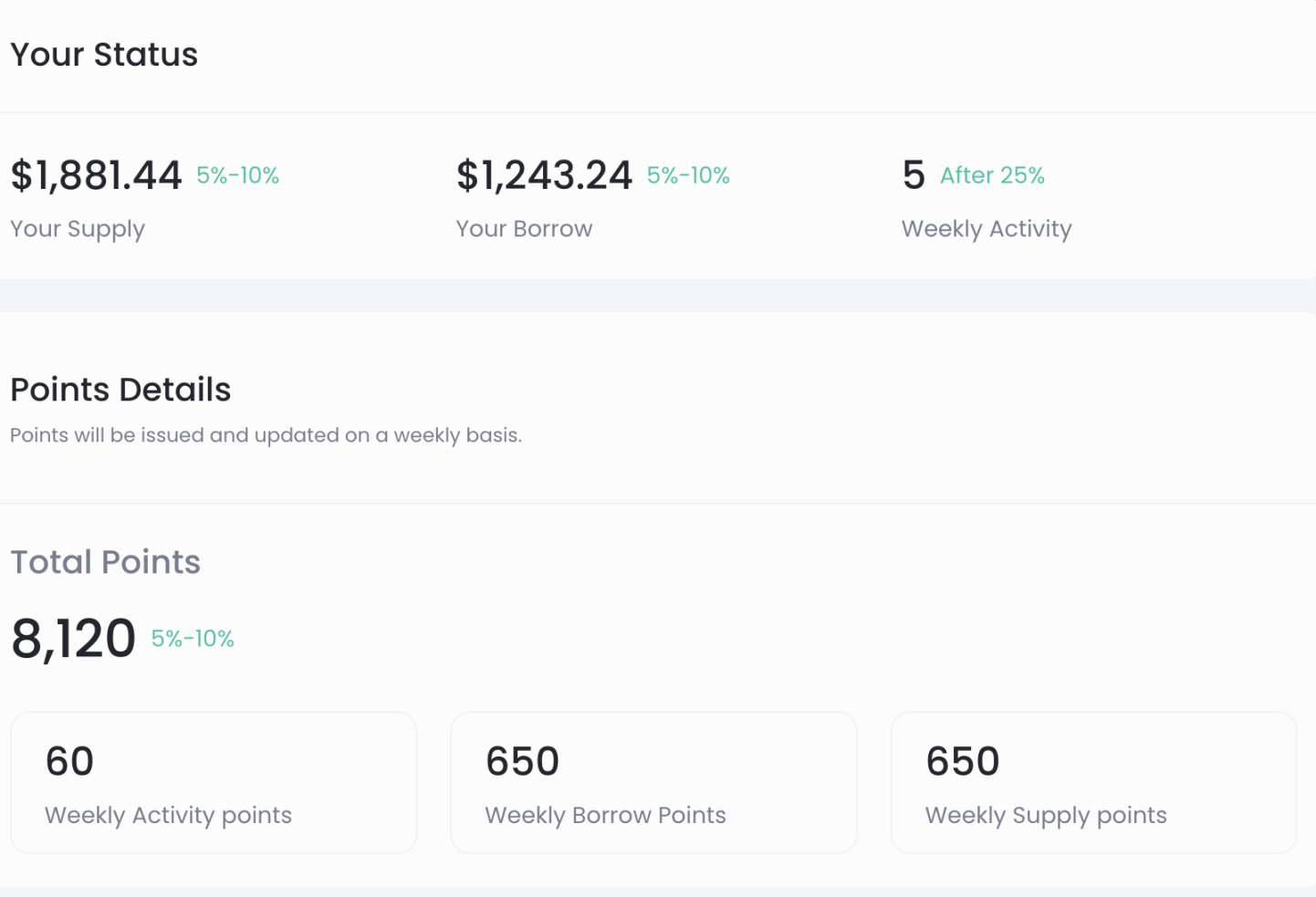 小技巧:Navi 借贷不收取一次性费用。巧妙循环贷能以较低的资本产生较高的积分。同时每周 200 的活跃分很好获取,每天及时领取存款奖励即可拿到大部分分数。