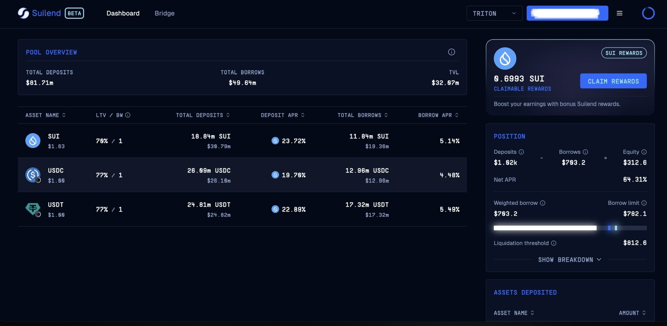 有了 Suilend Beta Pass 后,前往 Suilend 官网存款和借贷即可。由于 Sui Foundation 的 SUI 代币激励,Sui 上 DeFi 的利率都相当可观。需要注意的是 Suilend 上借贷会收取 0.3% 的一次性借贷费用,若是进行循环贷之类的操作收回成本需要不短的时间。