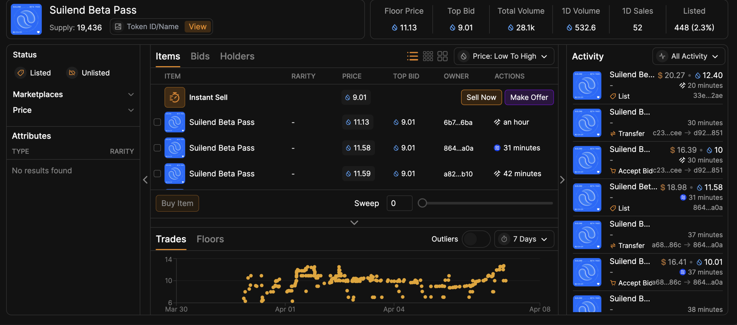 想要获得借贷协议空投,存款和借贷是必不可少的。但不同于其它无需许可的借贷协议,想要参与现阶段的 Suilend,用户需要持有 Suilend Beta Pass,一个 NFT 通行证。该 NFT 除了能在 Suilend 与其合作伙伴不时举行的活动中获得外,可以通过 tradeport 等 NFT 市场购买,目前地板价在 11 SUI 左右。