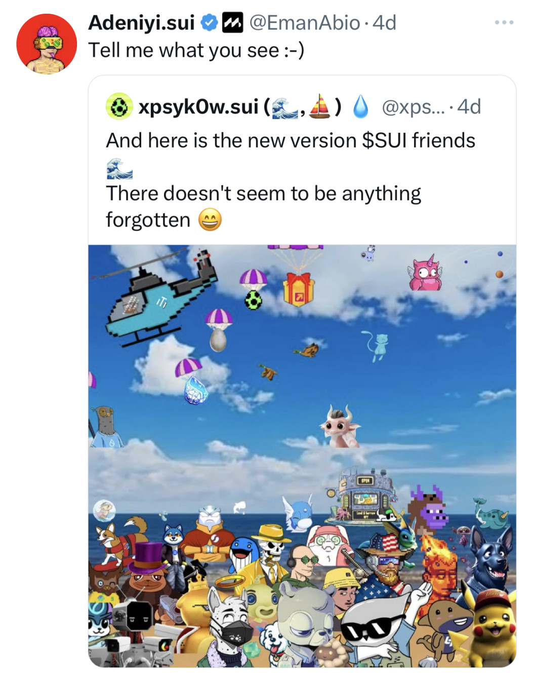 Adeniyi 是 Mysten Labs(Sui 开发公司)的 CPO、联创。几天前,他转发了一条带图推文并评论到:「告诉我你看到了什么 :-) 」。这张图上有许多降落伞?的图案和不同 Sui 上项目的相关形象——能识别出的形象有 Fuddies 与 DeSuiLabs(Sui 上头部 NFT)、Tails by Typus(NFT、Sui 上期权协议)、Aftermath Eggs(Sui 上交易聚合器、DEX)、FUD the Pug(Sui 上 meme 币)等等。