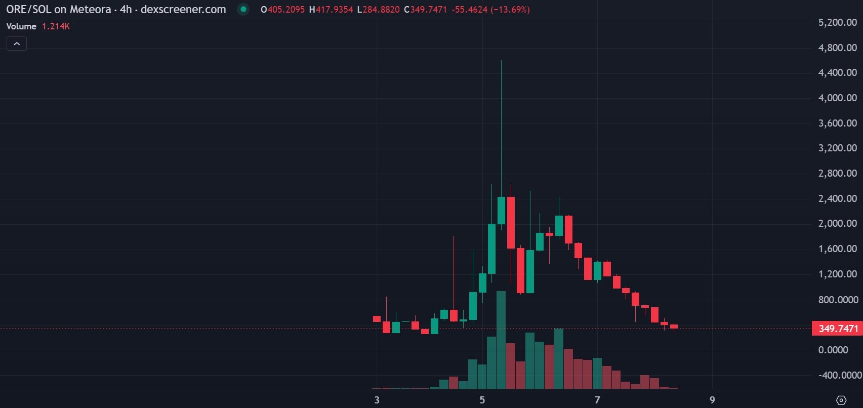 据 DEX Screener 数据 ,自 ORE 于 4 月 2 日上缐以来,价格从 4 日的最低点 260 美元𫔭始飙升,最高在 5 日冲上 4,703 美元,最大涨幅超过 1700%。
