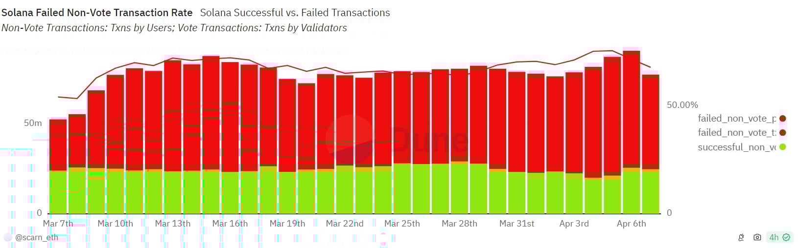 公 链 Solana 近日出现严重堵塞情况,许多用户发起的交易无法完成。据 Dune Analytics 数据 显示,Solana 网路失败的非投票交易比例,在 4 日飙升至超过 75%,创下有纪录以来的最高失败率,而造成 Solana 网路堵塞的其中一个主因,则与 Solana 生态挖矿项目「Ore」的横空出世有关。