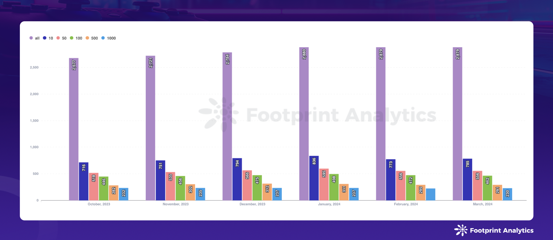 3 月份,活跃的区块链游戏数量稳定在 2,879 款,市场未见显著波动。然而,业界普遍期待能够出现重大突破,以大幅度提升用户参与度。