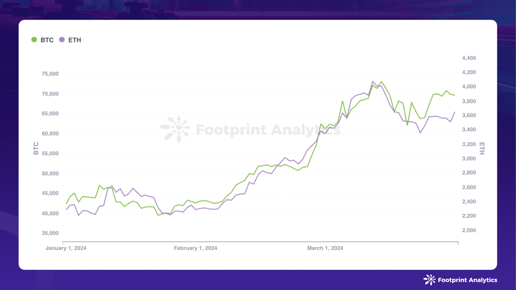 3 月份的加密货币市场表现强劲,这主要得益于市场对利率下降的预期,尽管整体经济表现强劲。这种前景加剧了通胀担忧,使比特币和黄金等资产更具吸引力。比特币的价格变动与美国比特币现货 ETF 表现紧密相关。月中价格的回落主要受到比特币现货 ETF 资金流入放缓和传统交易者降低杠杆的影响。然而,市场对 4 月份比特币减半事件的期待为其维持了上涨势头。