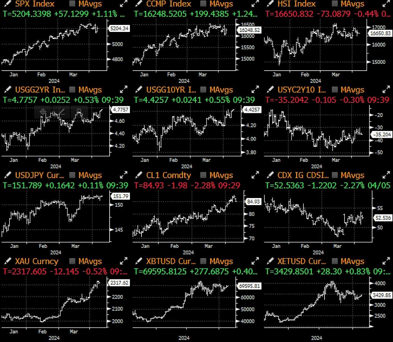 由于投资者对利率风险更加乐观,股市得以在收益率上升(上周五 + 9 个基点)的情况下上涨,再次证明股票投资者对任何情况都有无懈可击的看涨适应性(坏消息 = 降息,好消息 = 好消息),至少在本周稍晚的 CPI 数据发布前,风险情绪的派对仍在持续。