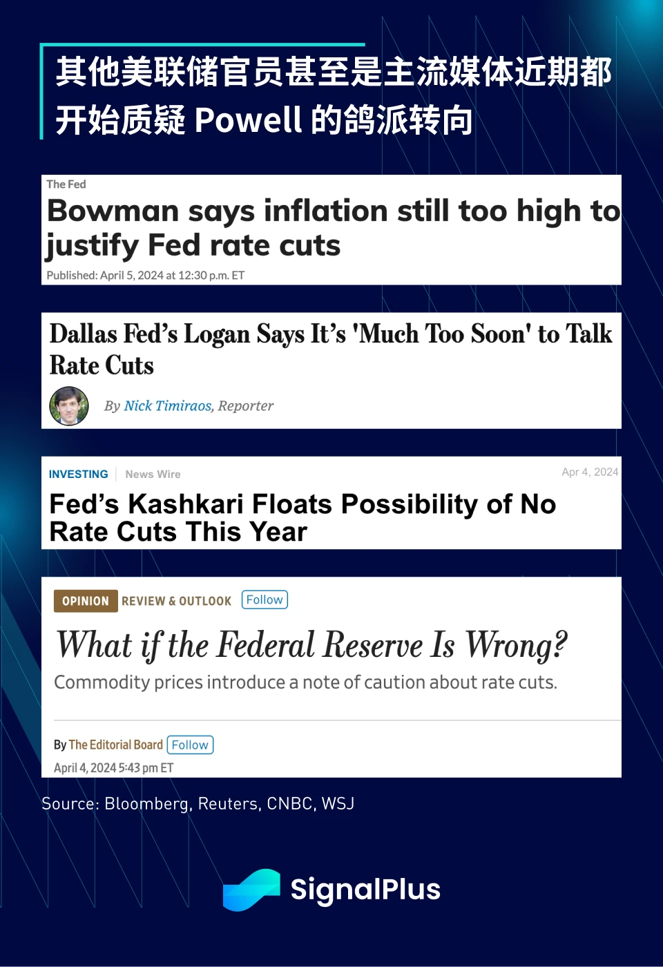 就业数据持续展现韧性,近期全球 PMI 指数也优于预期,加上大宗商品价格上涨带来通胀再起的压力,似乎为 Powell 的鸽派转向带来了相当大的挑战,美联储官员们也相继提出一些鹰派的反对意见:
