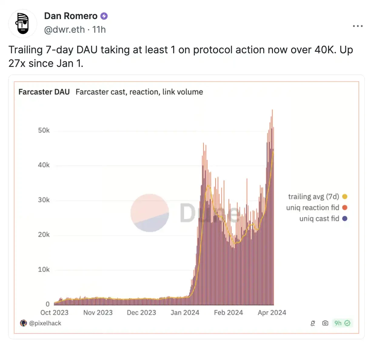 Farcaster 第一波用户增长是在 2024 年 2 月初,彼时 Farcaster 最大的前端协议 Warpcast 推出 Frame 新功能,为社交应用增加了很多可交互性。与此同时,DEGEN、FAR、FRAME 等 Farcaster 相关概念的 meme 币也让一批还不是 Farcaster 用户的人进场注册账号。但随着市场趋于冷静,关于 Farcaster 的炒作逐渐回落降温。但 3 月初,坎昆升级落地后,Base 生态活跃度骤增,以 DEGEN 为首的 meme 币为 Base、也为 Farcaster 注入了第二波血液。