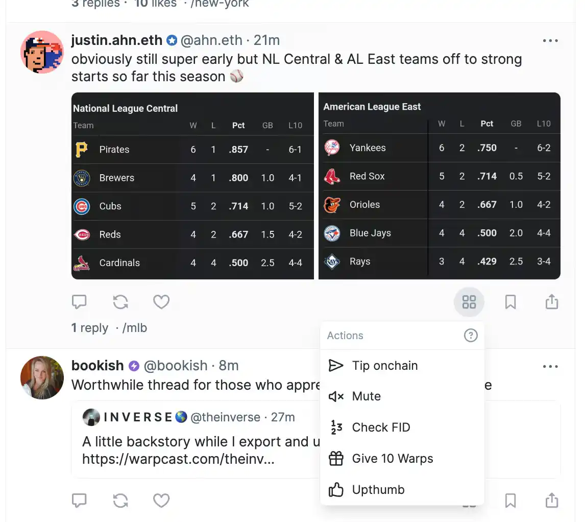 Actions 功能入口放在每条帖文的下方收藏分享栏附近,里面包含的小红能让 tip 文化进一步推进,用户不局限于仅用 DEGEN 打赏,除此之外,用户还可以使用查验 FID、赠送 Warps 等小功能,提升 Warpcast 的使用体验。