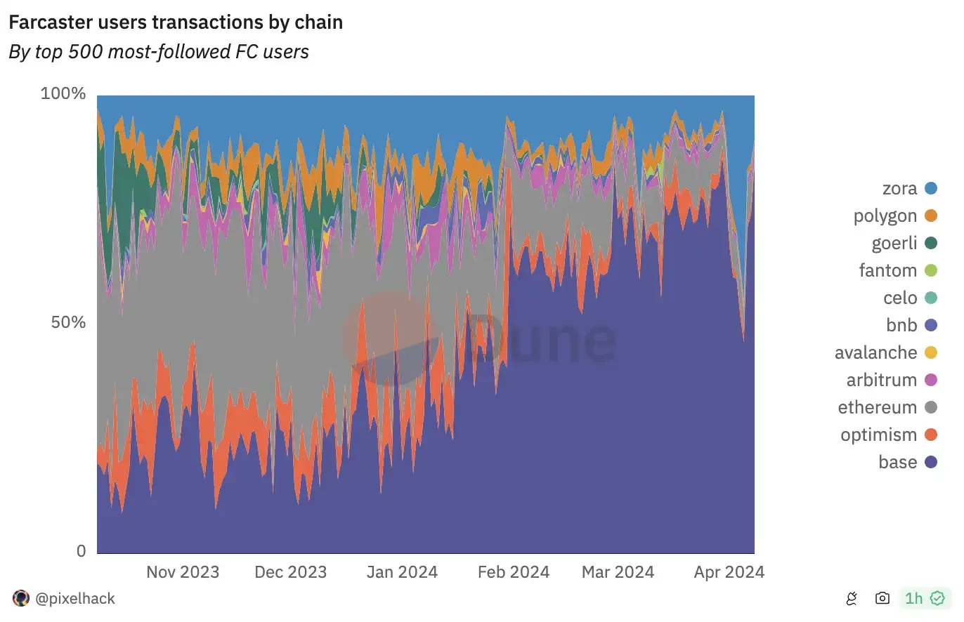 除了看到应用内的积极变化,不可忽视的还有 Farcaster 背靠的 Base、Zora 链上活动影响。得益于 Frame 的可交互功能以及长期耕耘的创作者文化,Farcaster 成为 Base、Zora 的「发射平台」,很多热门项目都从这里孕育并诞生。
