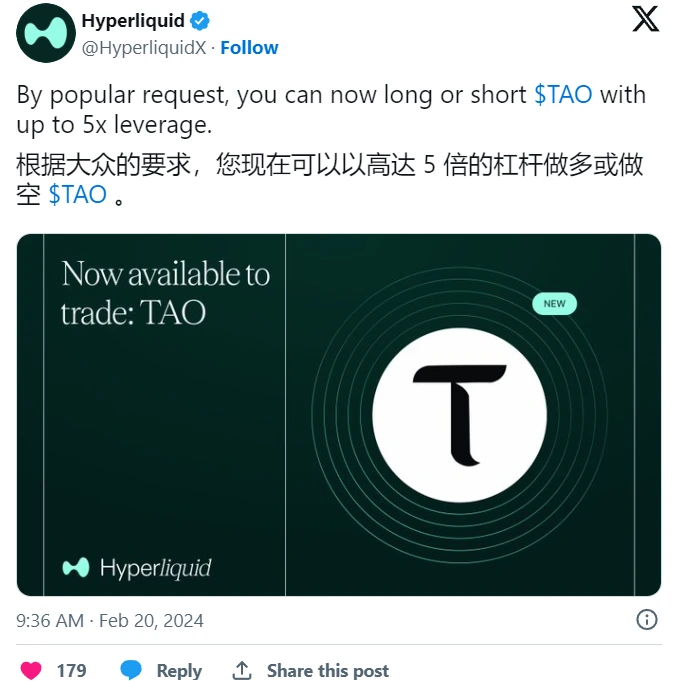 在二月份,Hyperliquid 扩展了其产品线,上线了 $TAO,为用户提供了在 TAO 上进行杠杆交易的机会,最高杠杆可达 5 倍。这个新增加增加了 TAO 的交易量。