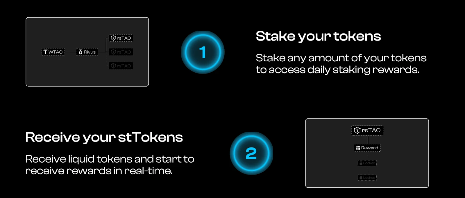 RivusDAO 为以人工智能为中心的区块链(包括 Bittensor)提供了流动性质押服务。它通过 $rsTAO 为 TAO 引入了一个流动性质押机制,使用户能够将他们的 wTAO 在以太坊上质押,并作为回报收到 $rsTAO 以获得质押奖励。