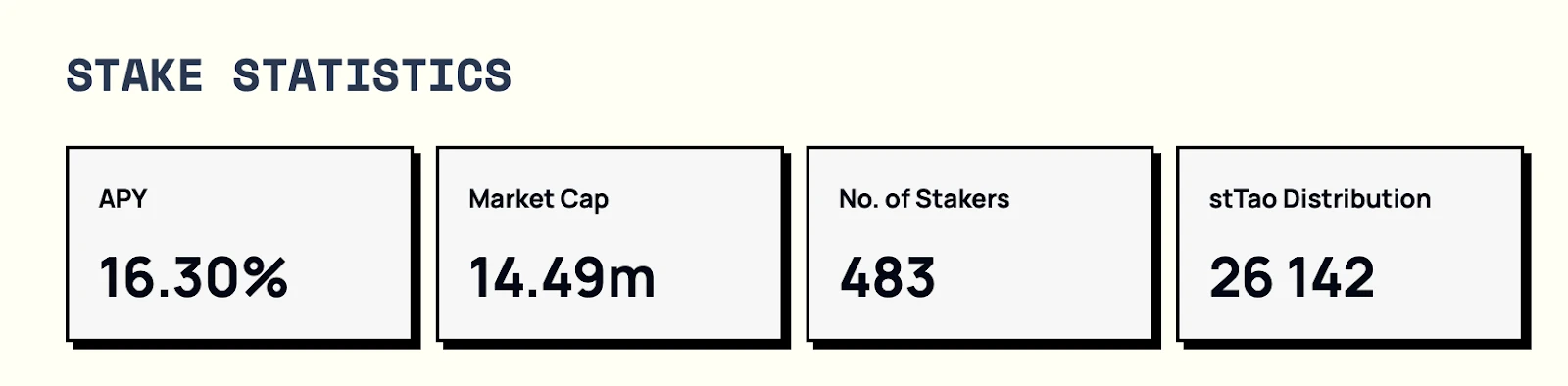 他们的一个产品 Tensorplex Stake ,于 2024 年 2 月在以太坊上推出,使用户能够参与在 Bittensor 网络上进行质押并获得收益(目前超过 16% )。