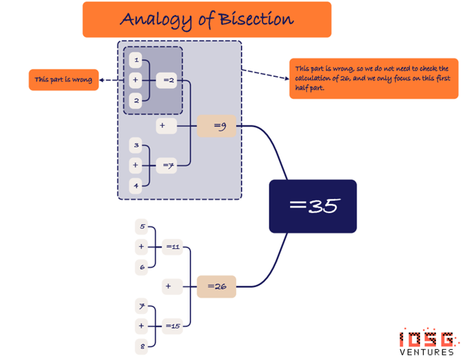 为了提高链上验证的效率,验证者可以利用二分法(Bisection),这是一种在预先提交的逻辑门上进行高效搜索的方法,以找到应该被挑战的逻辑门,这种方法相比随机挑战过程有显著的改进。通过将问题空间一分为二,分割法允许验证者快速缩小潜在错误的范围,从而减少了解决争议所需的步骤和时间。这种方法在处理复杂的验证过程时,尤其是在需要精确确定错误位置的情况下,提供了一个更为高效和直接的路径。