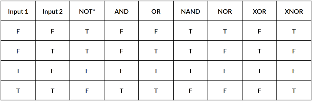 Source: Stepping Through Logic Gates; 基本逻辑门(F 代表 0 ,T 代表 1)