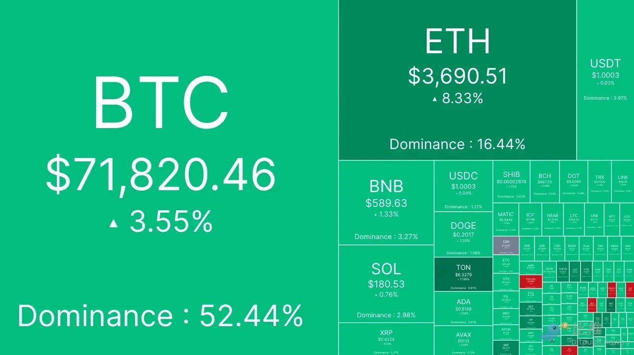 随着减半临近,比特币本周开局强劲,在周一早盘交易中飙升至 72, 000 美元以上,距离历史高点 73, 750 美元不到 3% 。 市场数据显示,在周末交易价格接近 69, 400 美元后,比特币多头在周一凌晨开始走高,突破 71, 000 美元的阻力位,在美国东部时间上午 8 点后不久触及 72, 780 美元的高点。 截至发稿时,比特币交易价格为 71, 845 美元, 24 小时涨幅 3.5% 。