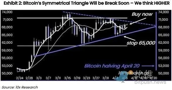 Thielen 的分析显示,根据目前的形态,三角线形态在 4 月 18 日「相遇」,如果是看涨突破,比特币可能会在未来几周内攀升至 80, 000 美元以上,在 69, 280 点买入并将止损设置在 65, 000 点似乎是「合适的」。