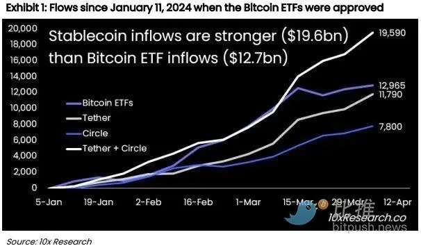 他说:「在过去 30 天里,我们看到 ETF 录得约 50 亿美元的净流入,而更值得关注的是, Tether 净流入了 69 亿美元, Circle 铸造了约 30 亿美元,总共有 100 亿美元的新资金通过稳定币进入。虽然比特币 ETF 的流量引起了媒体的关注,但与 ETF 相反,稳定币的铸造量是其两倍,而且可能只做多头。我们建议减少对比特币 ETF 流动的关注,稳定币发行商是需观察的对象,将推动这个市场走高。」