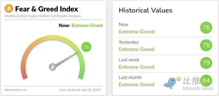 根据 Alternative 提供的数据,距离比特币减半仅剩 11 天,加密生态系统中的情绪仍处于「极度贪婪」领域。 目前加密货币整体市值为 2.69 万亿美元,比特币的主导率为 52.4% 。