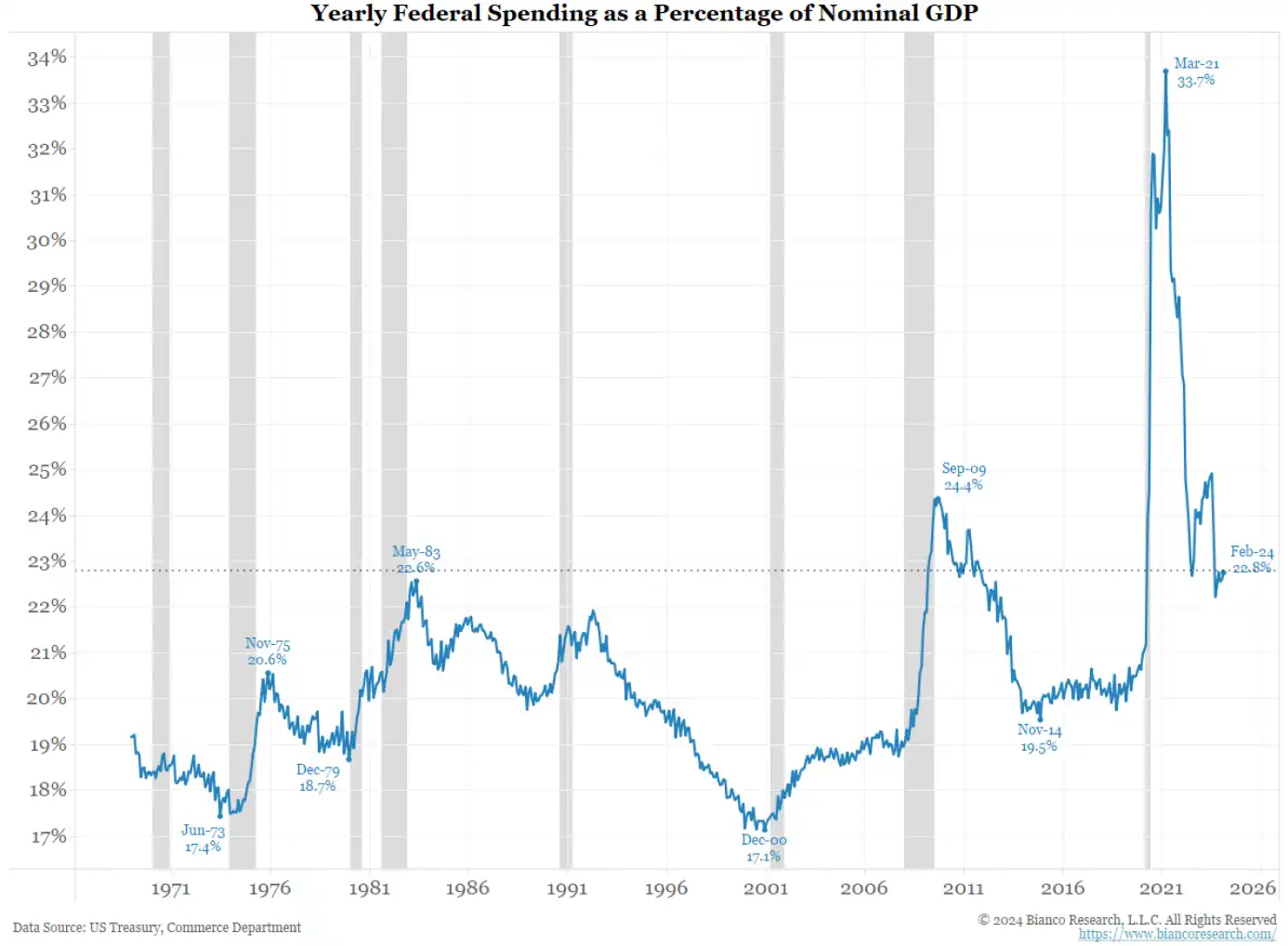 Bianco Research 的这张出色的图表清楚地表明了美国政府的浪费程度,创纪录的高赤字就证明了这一点。最近两个时期赤字支出较高的原因是 2008 年全球金融危机和婴儿潮一代主导的新冠疫情封锁。美国经济正在增长,但政府却像经济萧条一样花钱。