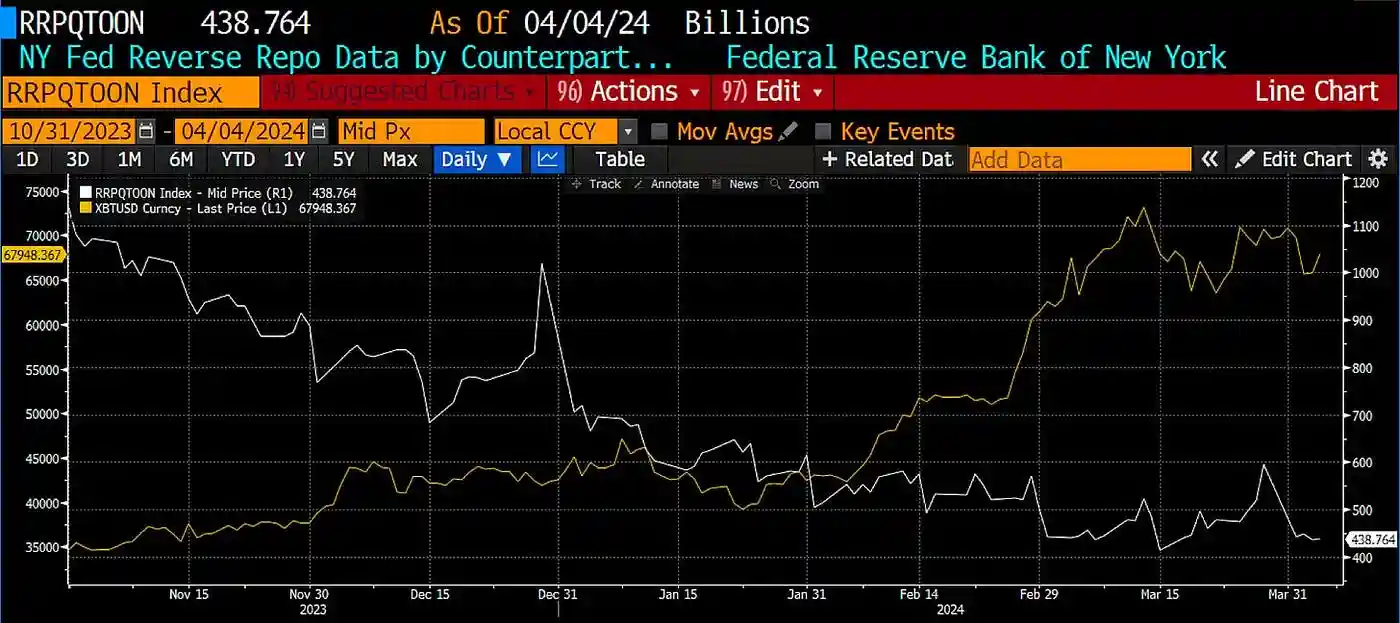 RRP 余额(白色)与比特币(黄色)